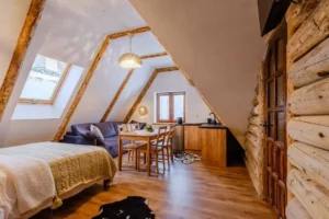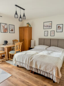 Wszystkie apartamenty o powierzchni ok. 30 m2 wykończone są w stylu regionalnym z zdumiewającymi dodatkami. Każdy apartament posiada łazienkę (WC, prysznic, umywalka, suszarka, ręczniki itd.). Pokoje posiadają aneks kuchenny z pełnym wyposażeniem tj, zlew, czajnik, lodówka, płyta grzewcza, naczynia i sztućce. W pokojach komfortowo zaścielone łóżka. Każdy za apartamentów wyposażony jest w płaski telewizor, a goście mogą korzystać z darmowego szybkiego internetu.